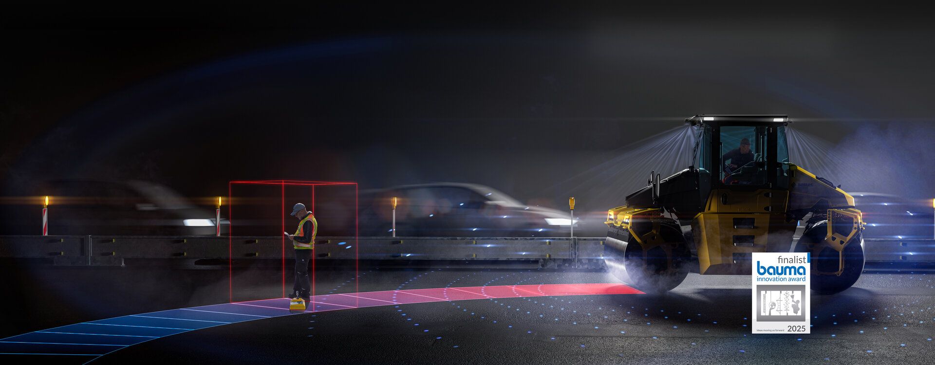 BOMAG Emergency Brake Assist detects potentially hazardous situations for asphalt rollers and automatically slows or stops the machine when necessary. The system uses LiDAR technology and real-time data to identify both moving and stationary obstacles, even in low-visibility conditions.